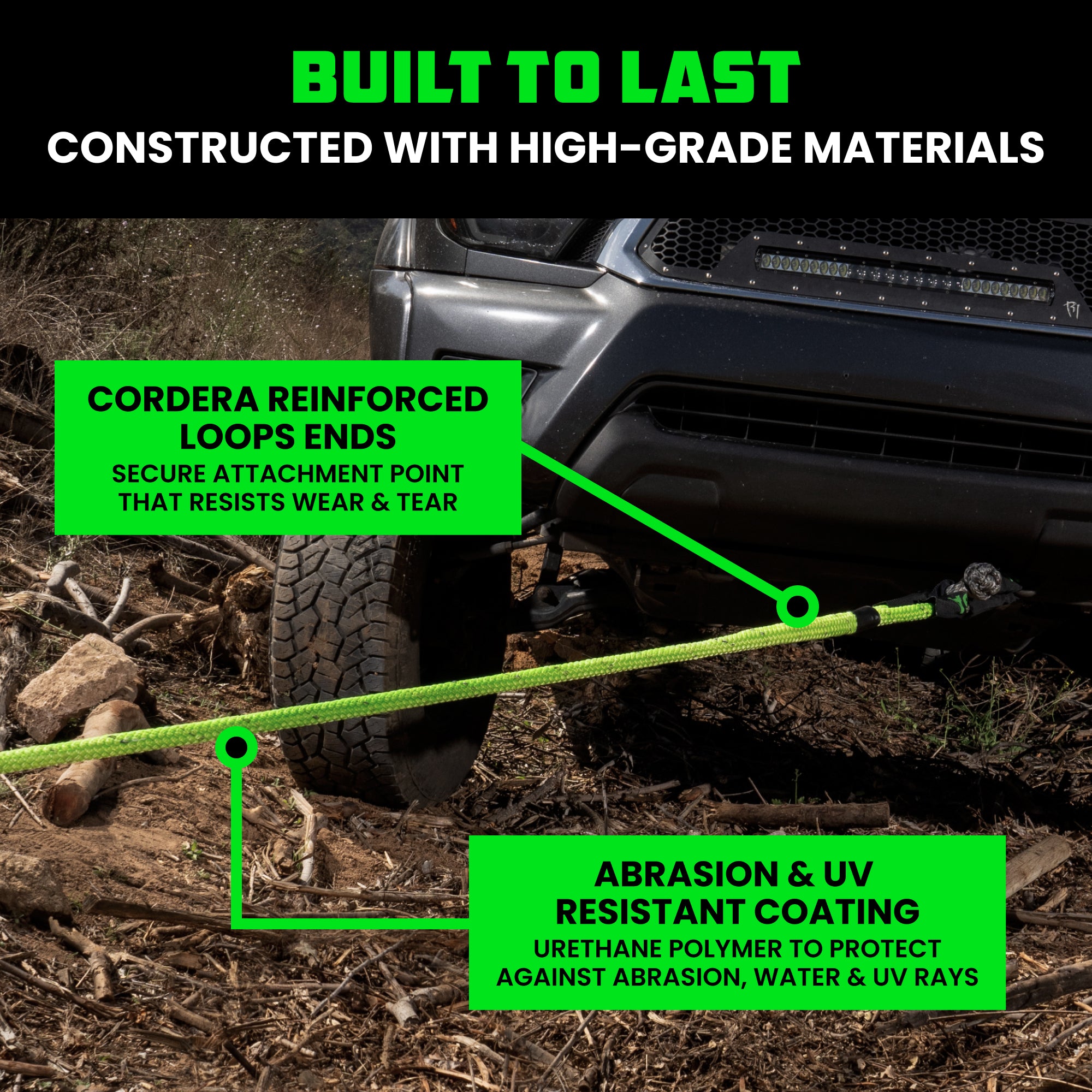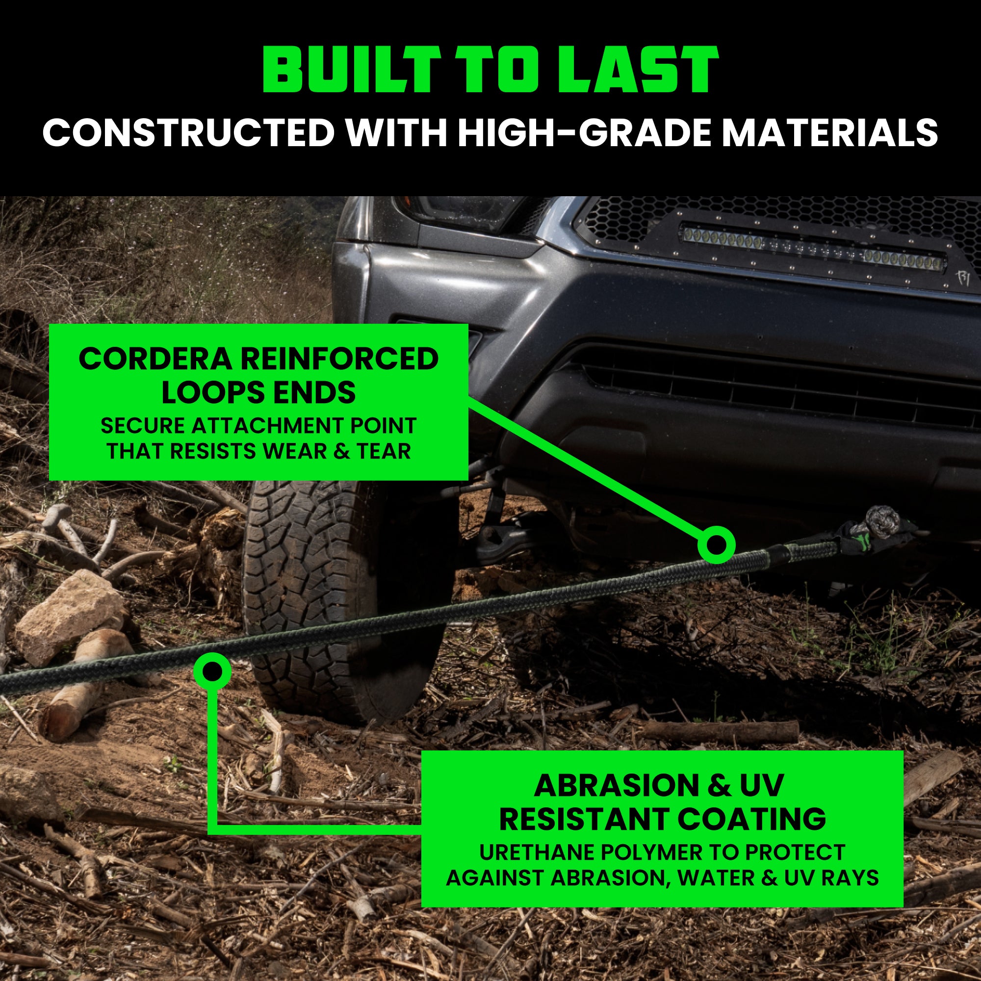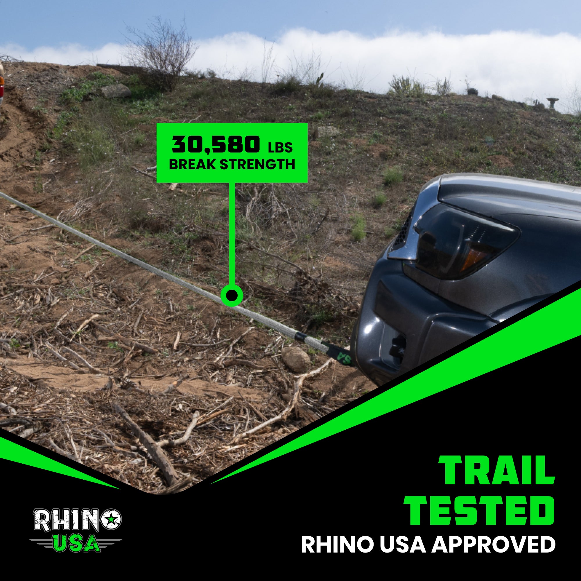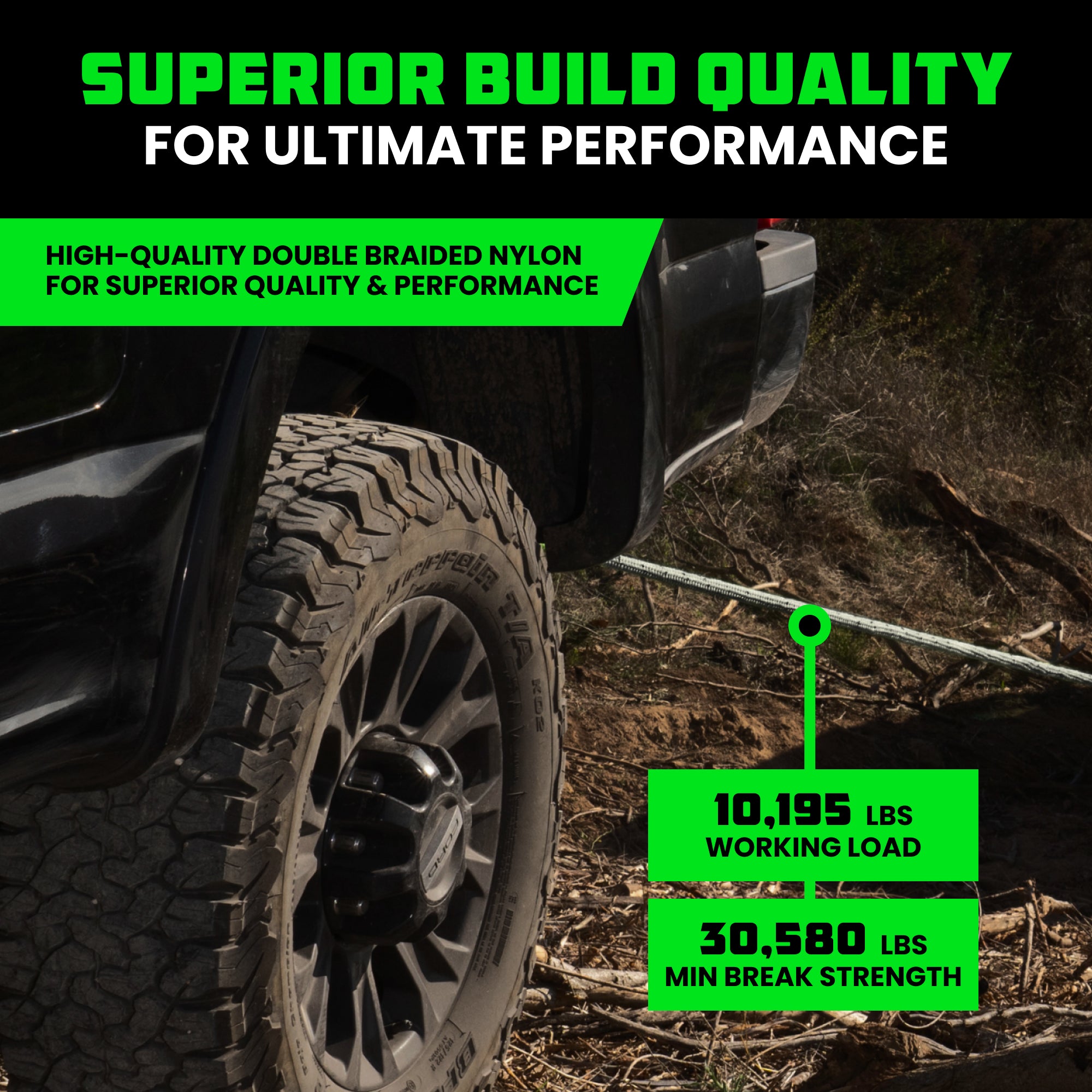Our 1" x 10' rope has a minimum breaking strength of 30,580 lbs, making it strong enough for trucks, Jeeps, SUVs, and UTVs.