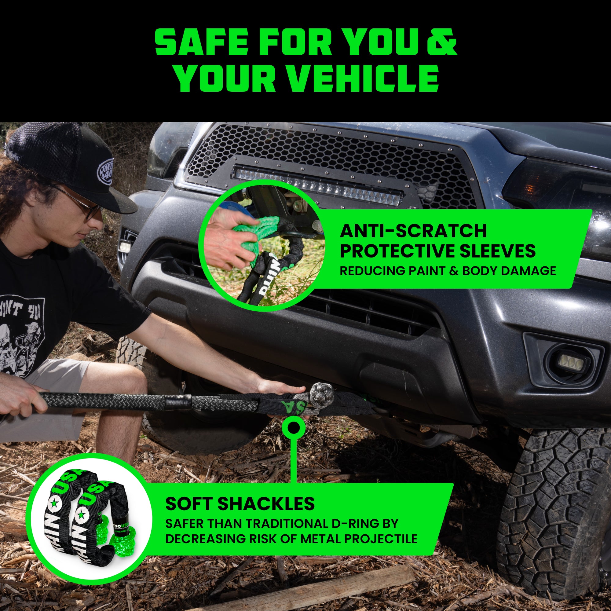 The kit includes two 3/8” soft shackles made from high-strength synthetic fiber with protective sleeves. These shackles won’t scratch paint or damage body panels, and they can attach in places where D-rings won’t fit. Their lightweight design also lowers the risk of dangerous projectiles compared to metal hardware, giving you added peace of mind.