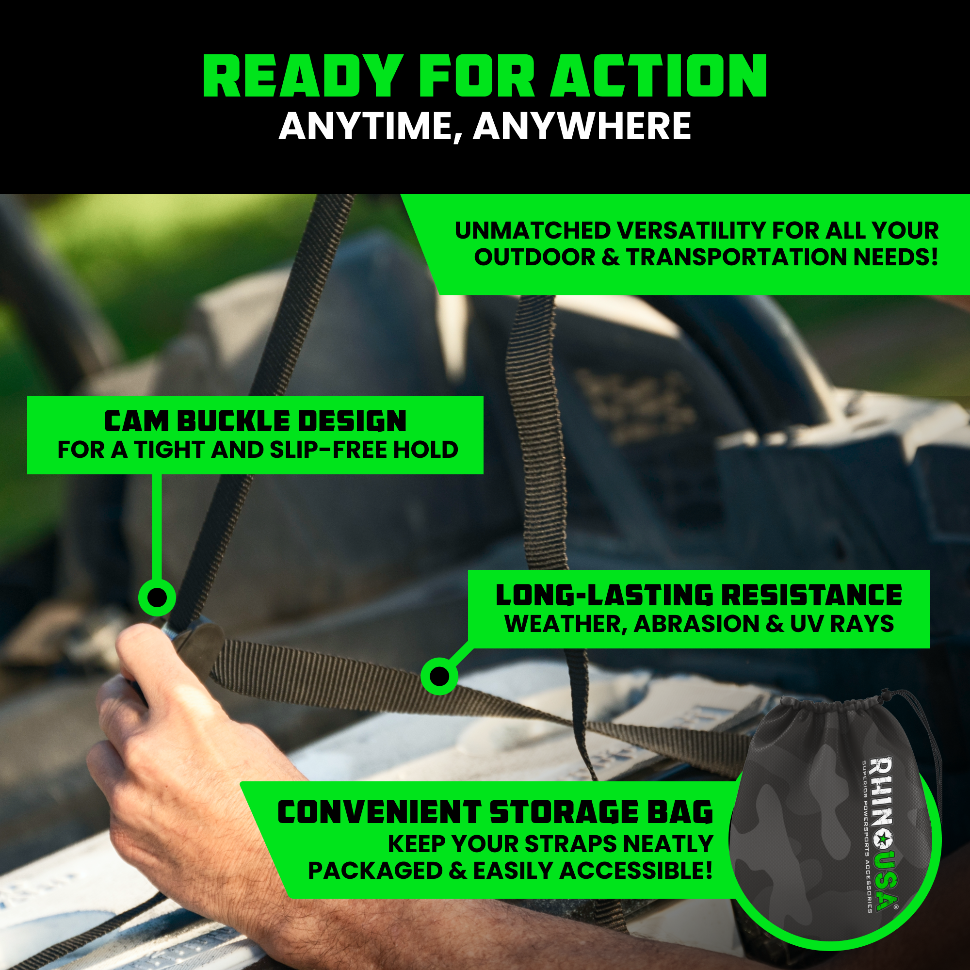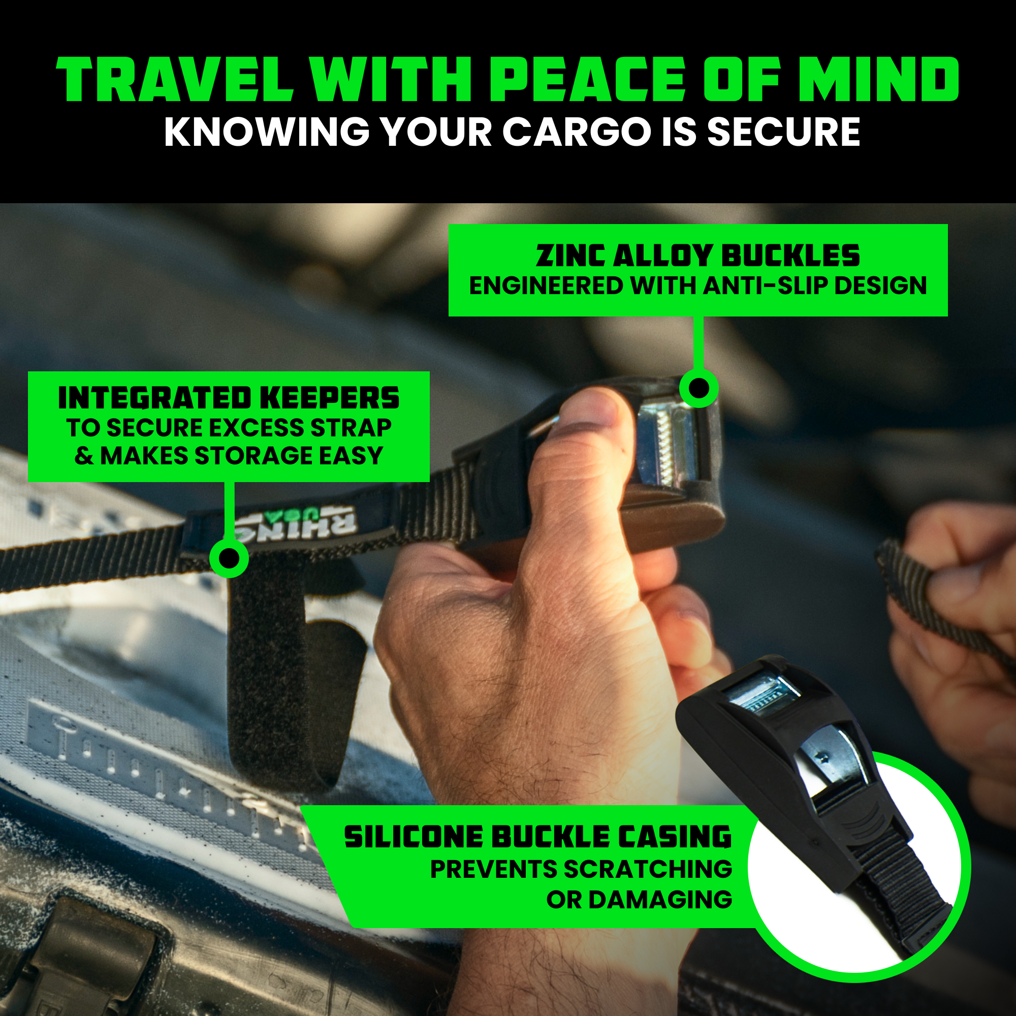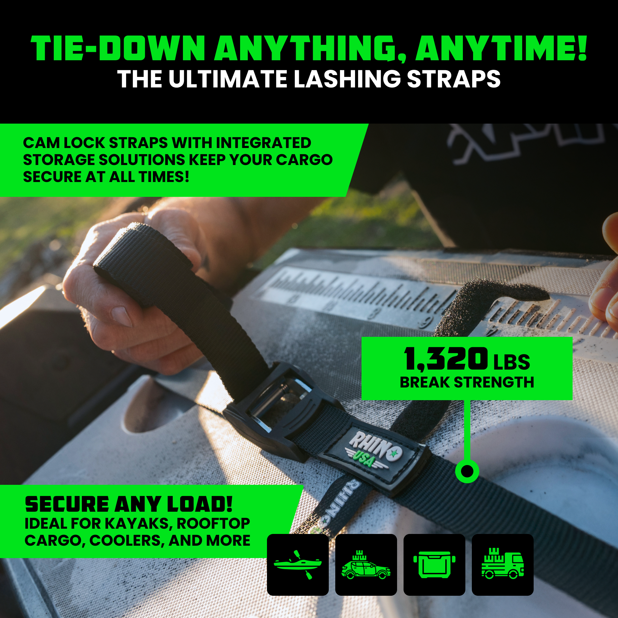 Rhino USA lashing tie down straps are built to last. Crafted with high-quality materials, these straps are designed to withstand heavy loads and endure the rigors of transportation. They are resistant to abrasion, UV rays, and weather conditions, ensuring their long-lasting performance. The ultimate lashing straps are made with zinc alloy buckles in silicone housing with integrated hook and loop fasteners.