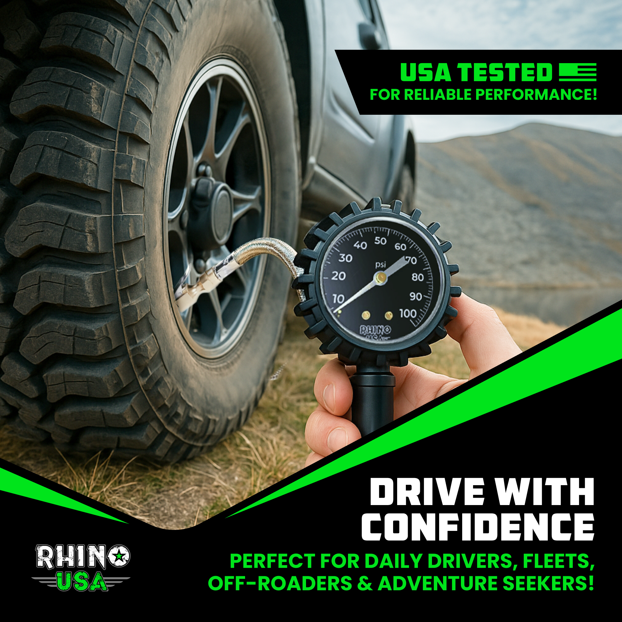 This tire inflator gauge is equipped with a versatile inflation trigger that allows for controlled and effortless inflation. Whether you need to inflate car tires, bike tires, sports equipment, or inflatable toys, this tool provides the versatility to handle various inflation needs with ease. The 100PSI Tire inflator gauge features interchangeable solid brass chucks, a durable “no leak” braided hose, and a rugged cover for maximum protection. This is a heavy duty tire inflator gauge, designed for long journeys on the road with a motorcycle, UTV, truck, or SUV.