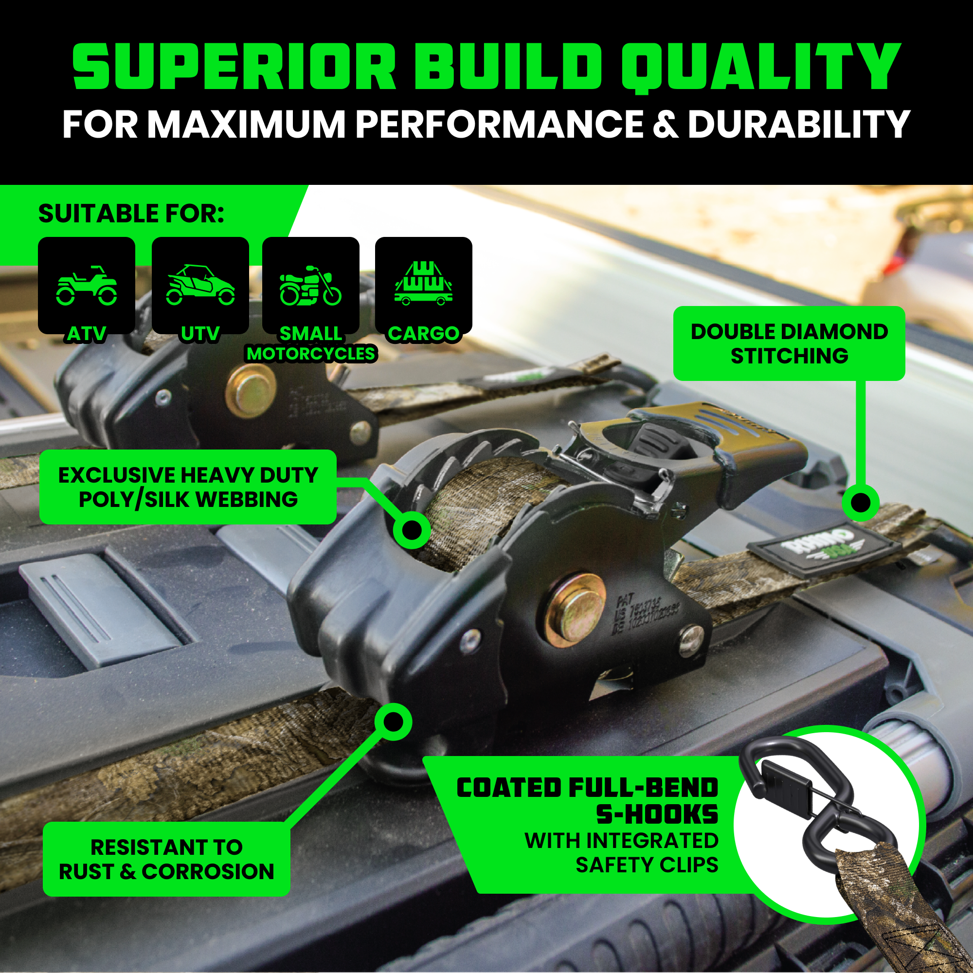 These break strengths are higher than industry standard for retractable ratchet straps.