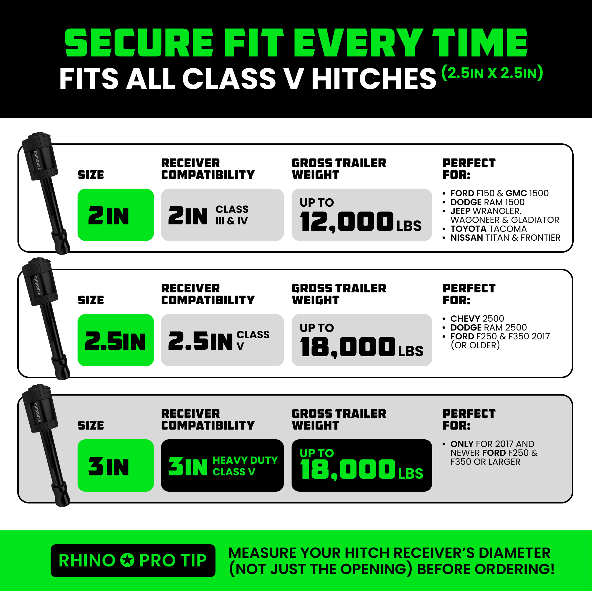 2.5” Locking trailer hitch pin: Fits all class V hitches (2.5” x 2.5”)