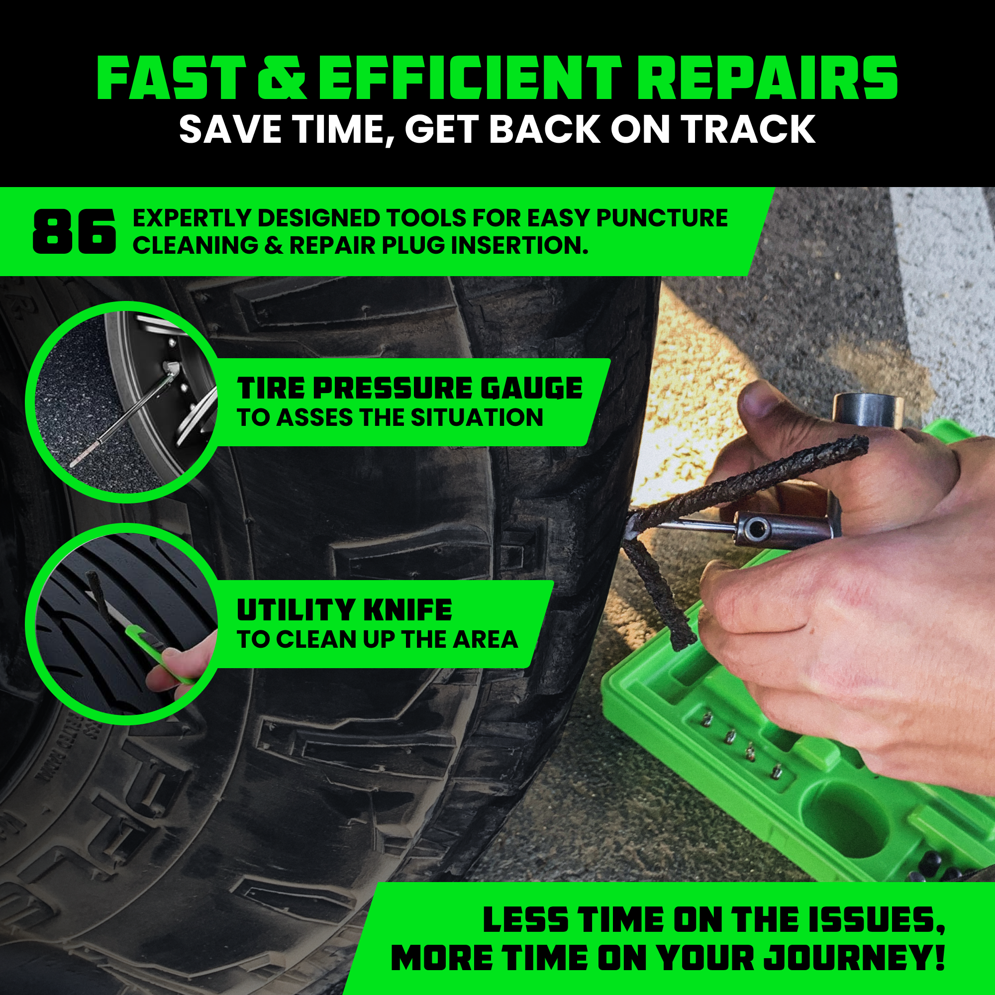 The kit includes multiple tire repair plugs, and each plug can typically be used for one puncture repair. However, it is recommended to replace the plug after each repair.