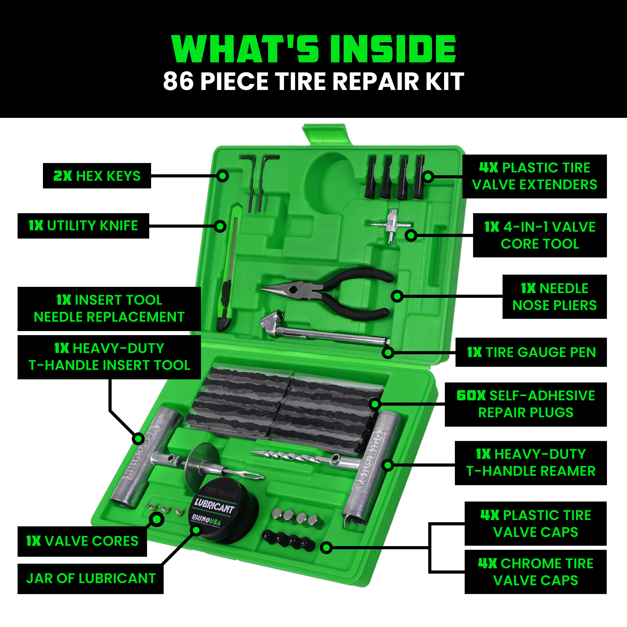The Rhino 86 Piece Tire Repair Kit is a complete solution for handling tire punctures and repairs. It includes a wide range of essential components such as tire plugs, patches, a T-handle insert tool, a rasp tool, rubber cement, and more. With this kit, you have everything you need to fix punctures quickly and efficiently.