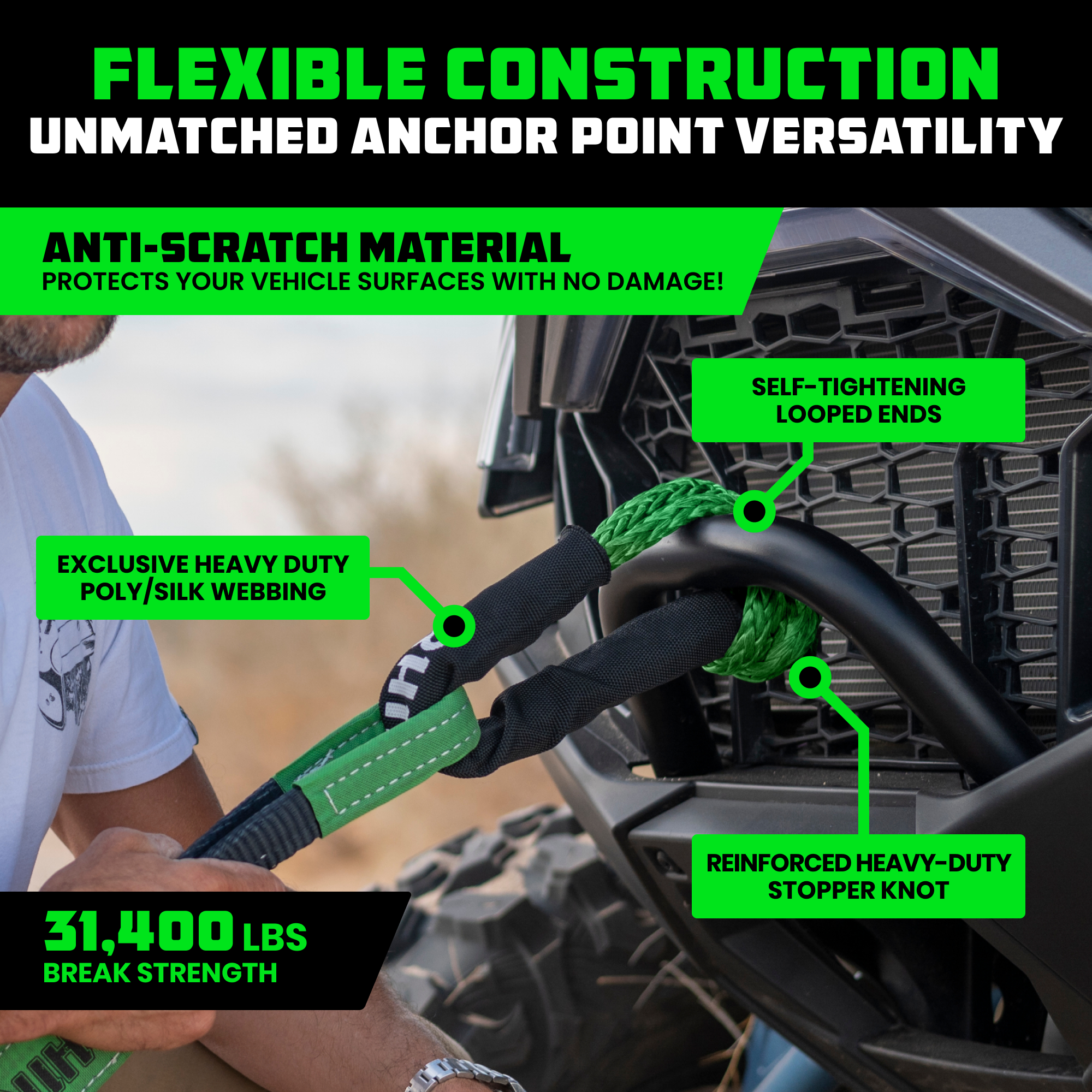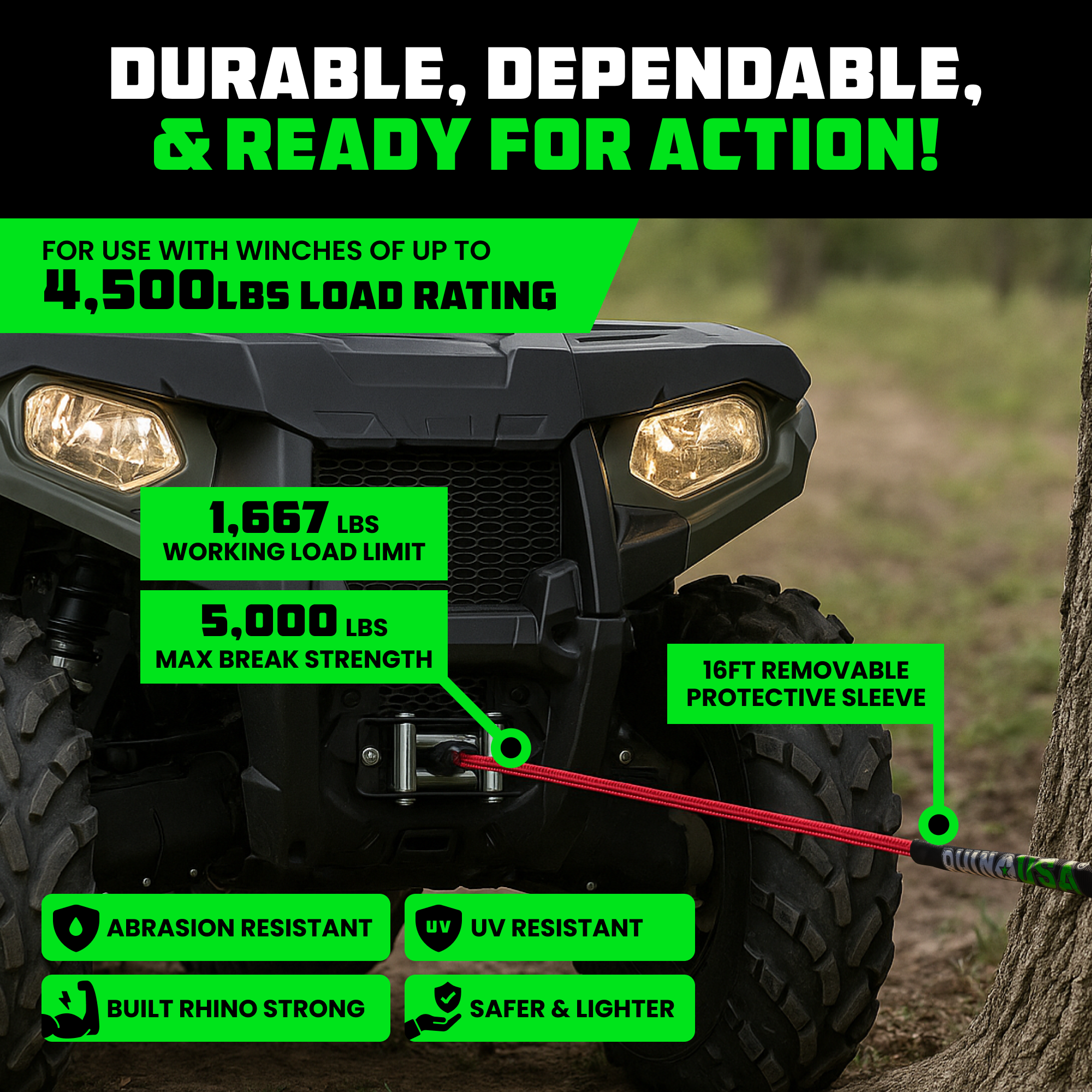 Designed for optimal performance and durability in the toughest conditions, this high-quality winch line is crafted from high-strength UHWMPE fibers and features an integrated protective sleeve for superior durability on the roughest trails. Compared to traditional steel cables, our next-generation synthetic materials offer unmatched safety and performance.