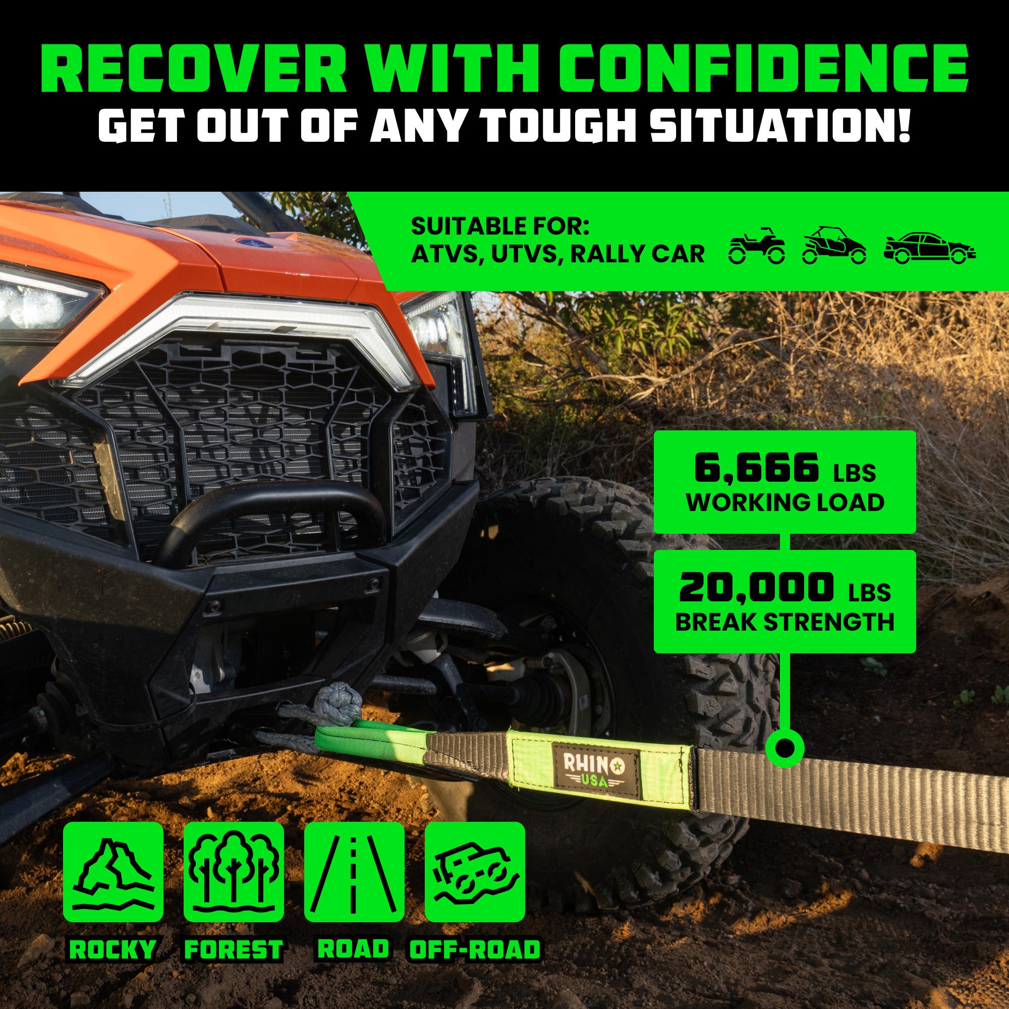 When the ride goes sideways, the Rhino USA Tow Strap gets you back in motion. Rated for serious strength and built with reinforced loop ends, it’s your go-to for quick recoveries or pulling a buddy out of trouble. Designed to work seamlessly with your Soft Shackles and Recovery Bag, this strap is a must-have for every off-road mission.