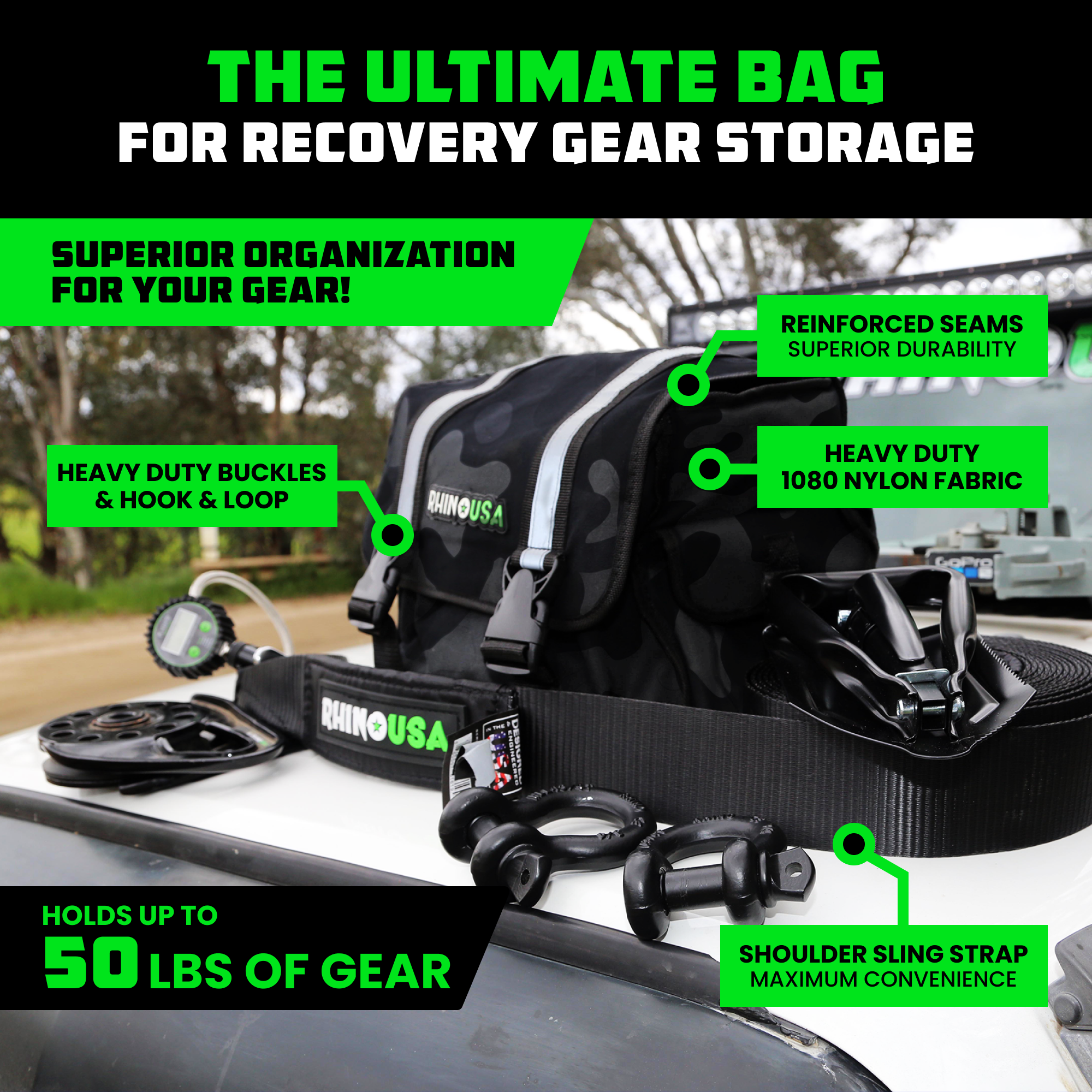 The finishing touch to your adventure setup. Durable, weather-resistant, and built to handle mud, dust, and everything in between, the Rhino USA Recovery Storage Bag keeps your entire kit organized and ready for action. Load it up with your straps, shackles, and tools — then throw it in your rig knowing you’ve got everything you need for whatever lies ahead.