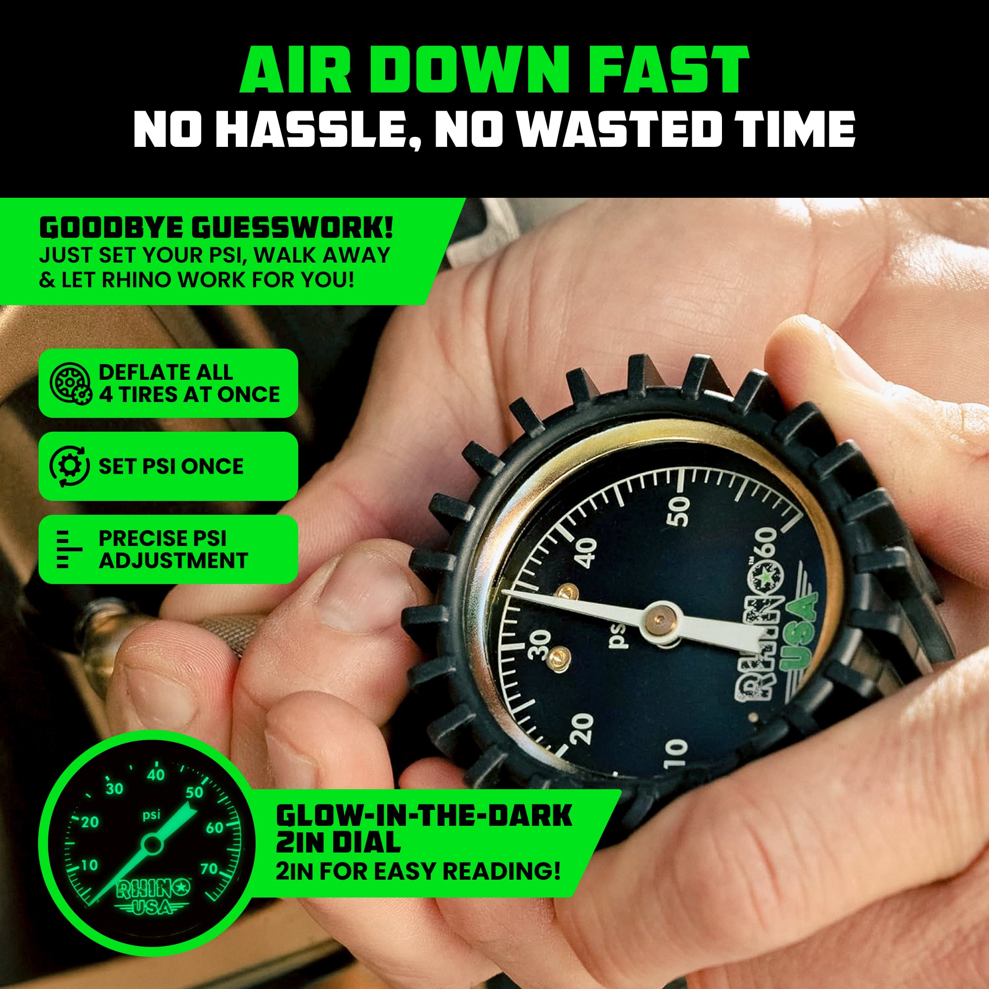 With the Rhino USA Pro Tire Deflator Kit, tire deflation becomes quick and hassle-free. The kit features a user-friendly 60PSI tire gauge for double checking PSI after the deflators release the desired amount of air. This saves you time and effort, enabling you to focus on your off-road adventures.