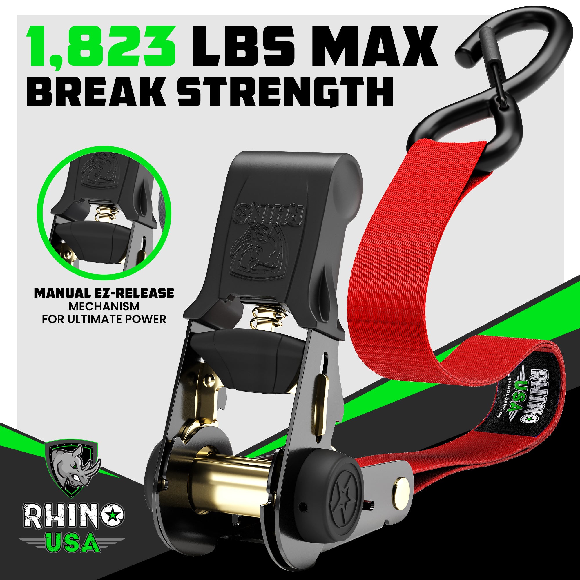 The Rhino USA Medium-Duty Ratchet Tie Down Straps are made with superior materials, including an anodized ratchet, ergonomic padded handles, and coated full-bend S-hooks. These features ensure that the straps not only hold up under pressure but also provide a comfortable grip and secure attachment every time. With a working load limit of 607 lbs and a maximum break strength of 1,823 lbs, these straps are engineered to handle heavy-duty tasks with ease.