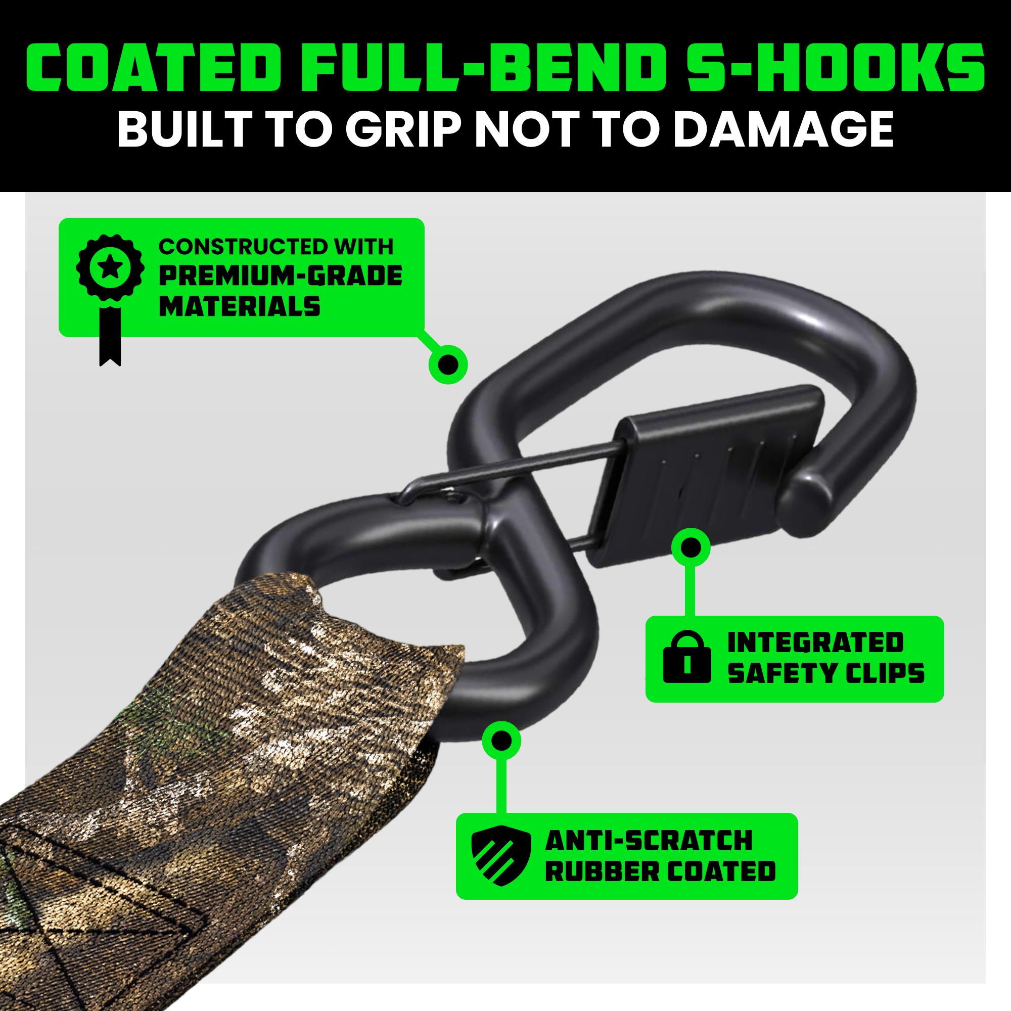 Absolutely! These straps are made from high-quality materials, including anodized ratchets and coated S-hooks, which are designed to withstand outdoor conditions, ensuring durability and long-lasting performance.