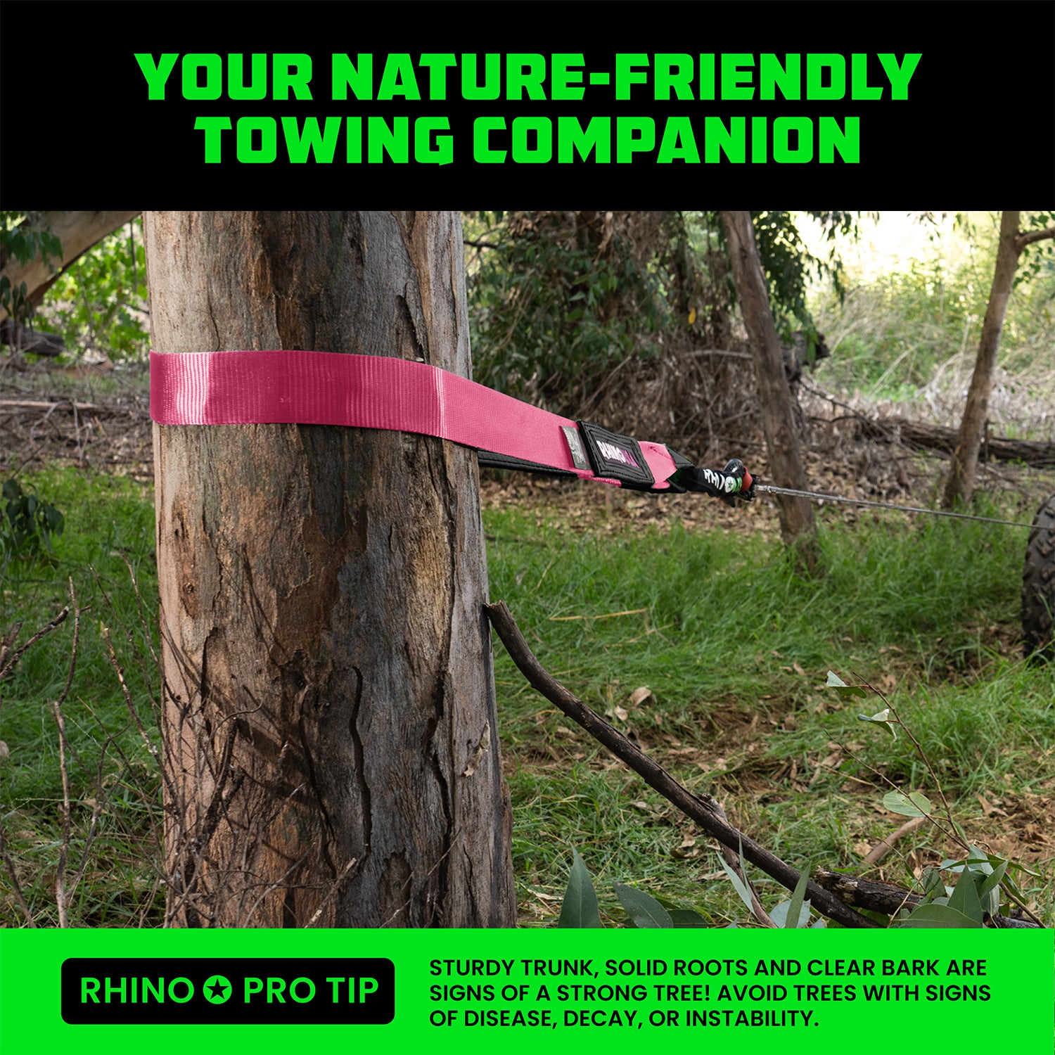 A close-up of a bright green Rhino USA tree saver strap wrapped around a tree trunk, with a metal pulley attached. The strap is used for off-road vehicle recovery. Trees and blue sky are visible in the background.