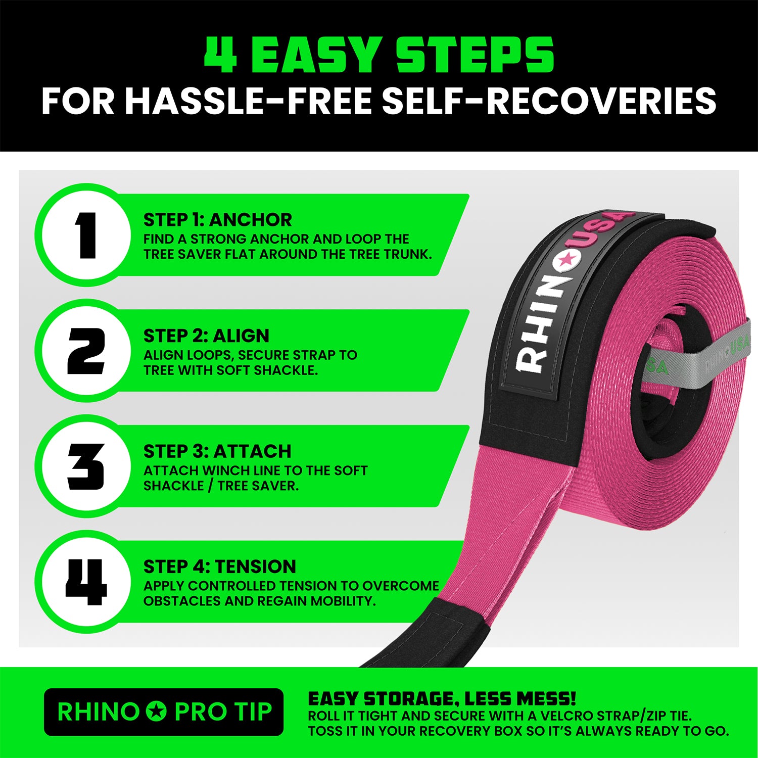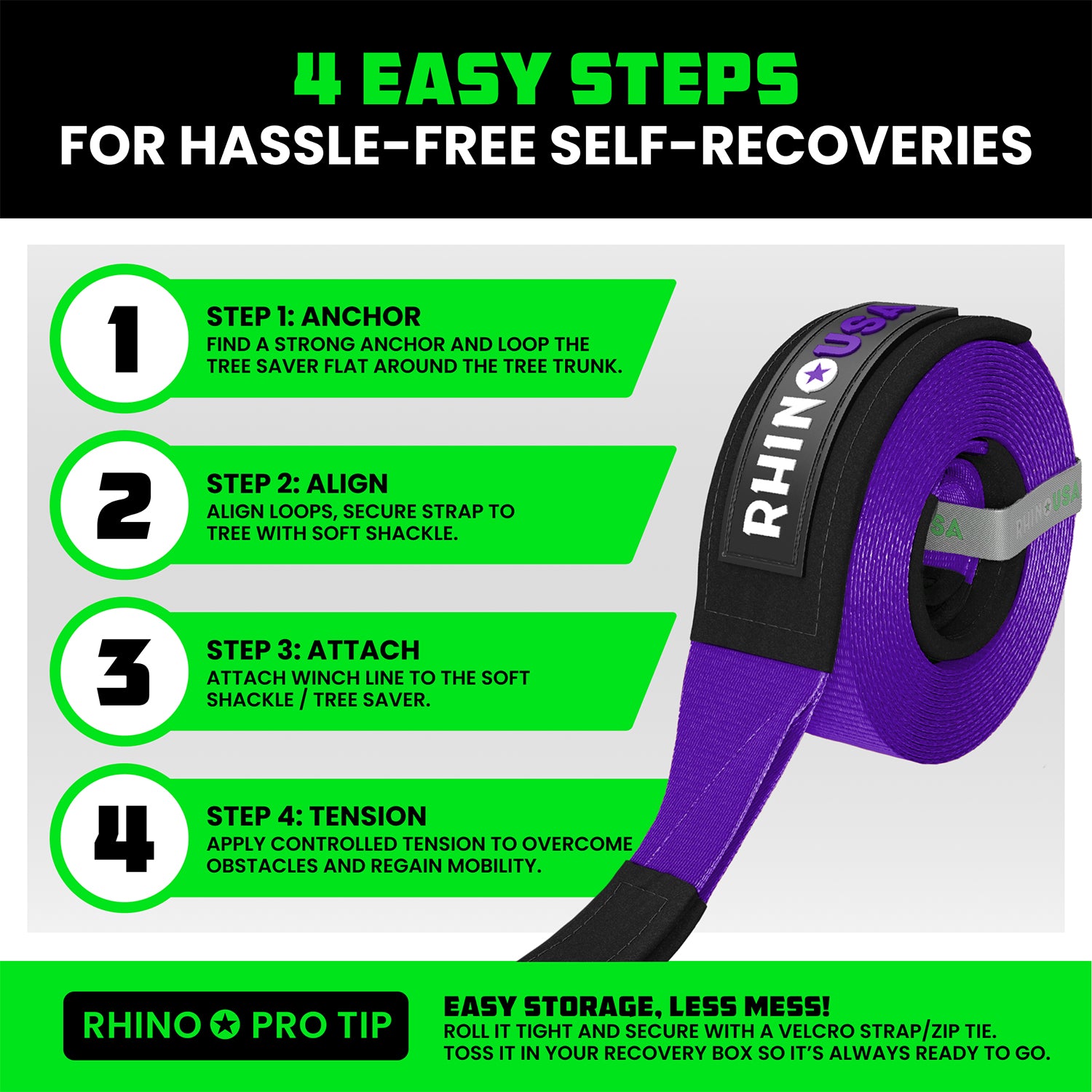 Introducing the Rhino USA Tree Saver Winch Strap, your ultimate solution for safe and efficient off-road recoveries. Engineered with uncompromising quality and rugged durability, this winch strap is designed to protect both your vehicle and the environment. The heavy-duty strap is specifically crafted to secure around trees without causing any damage, allowing you to safely extract your vehicle from challenging situations. With its high tensile strength and reinforced stitching, the Rhino USA Tree Saver Winch Strap delivers reliable performance when you need it most.