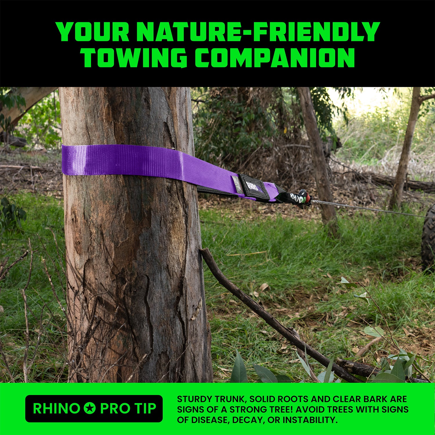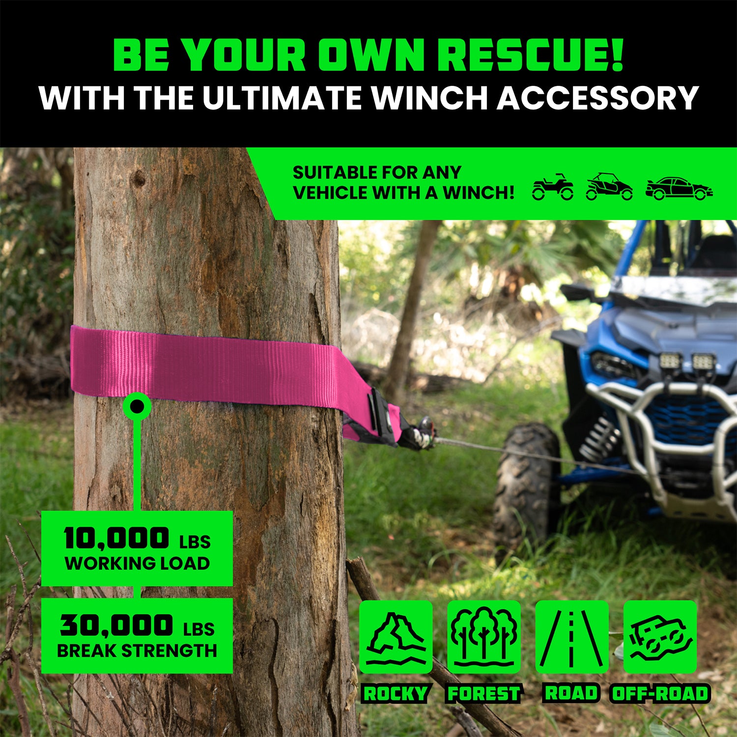 The winch strap features a tree-friendly design that prioritizes the protection of trees during recoveries. The wide strap distributes the load evenly and prevents damage to the bark, minimizing the impact on the environment. This design allows for safe and responsible off-road recoveries without compromising the health and integrity of the trees or the look of your vehicle.