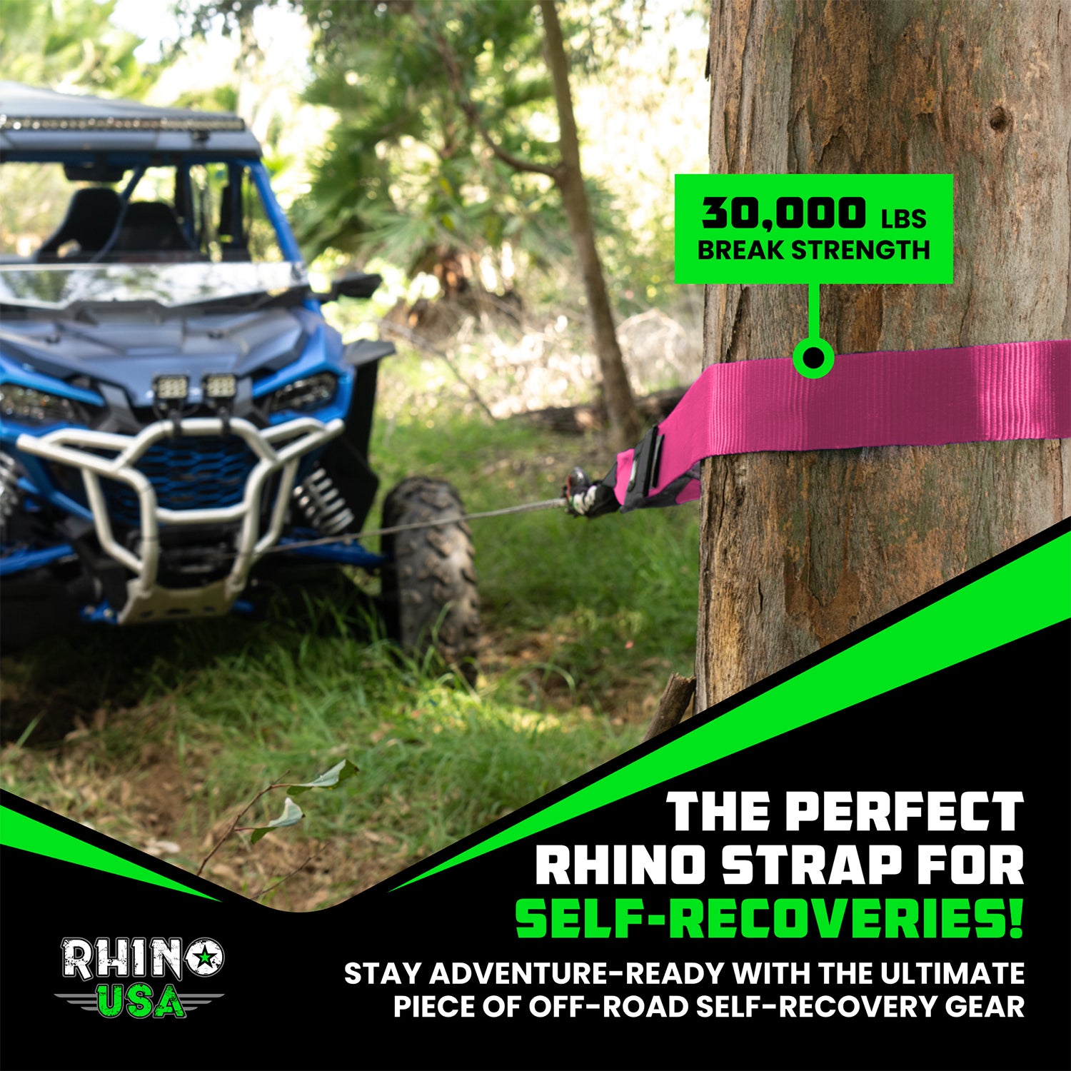 A rugged off-road vehicle with Rhinousa on the windshield is parked on dirt, attached to a heavy-duty tow strap connected to the front bumper. The tires are large, and the background shows a rural outdoor setting.