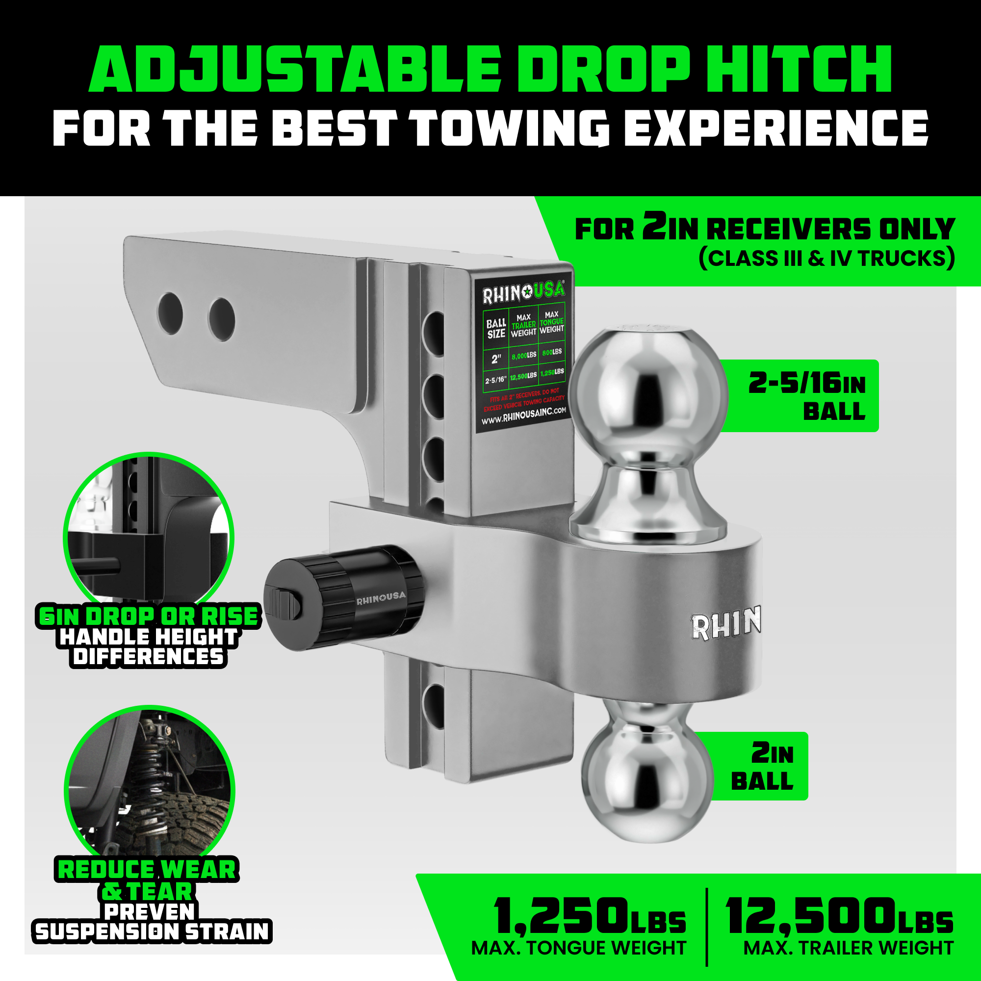 Level up your tow rig with the 2" x 6" Drop Hitch — forged from solid aluminum and built to handle an impressive 12,500 lbs GTW. Designed for trucks and SUVs with a hitch height of 16" to 20", it keeps your trailer perfectly level for a smoother, safer pull. Finished with a premium anodized coating, this hitch delivers the perfect mix of lightweight strength, durability, and style for any serious towing setup.