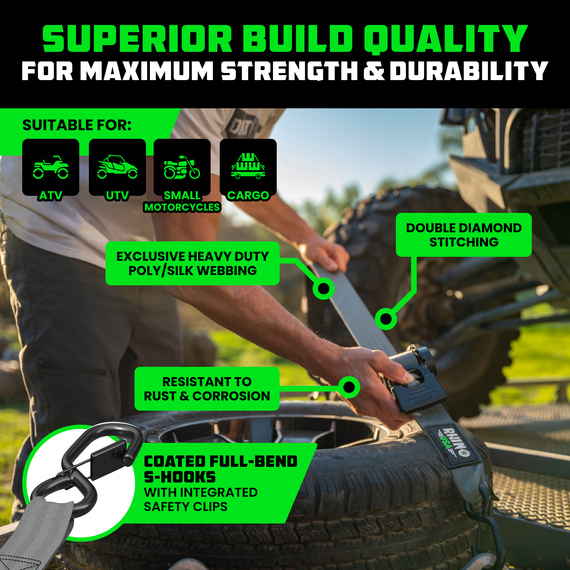Secure your ride like a pro with the 2" Retractable Ratchet Straps — the ultimate tie-down solution for Side by Sides, ATVs, and heavy equipment. A great addition to your trailering setup, these straps feature heavy-duty construction and coated S-Hooks with safety keepers for unbeatable holding power. Whether you're hauling to the dunes, trails, or job site, these straps make sure your machine stays locked and loaded the whole way there.