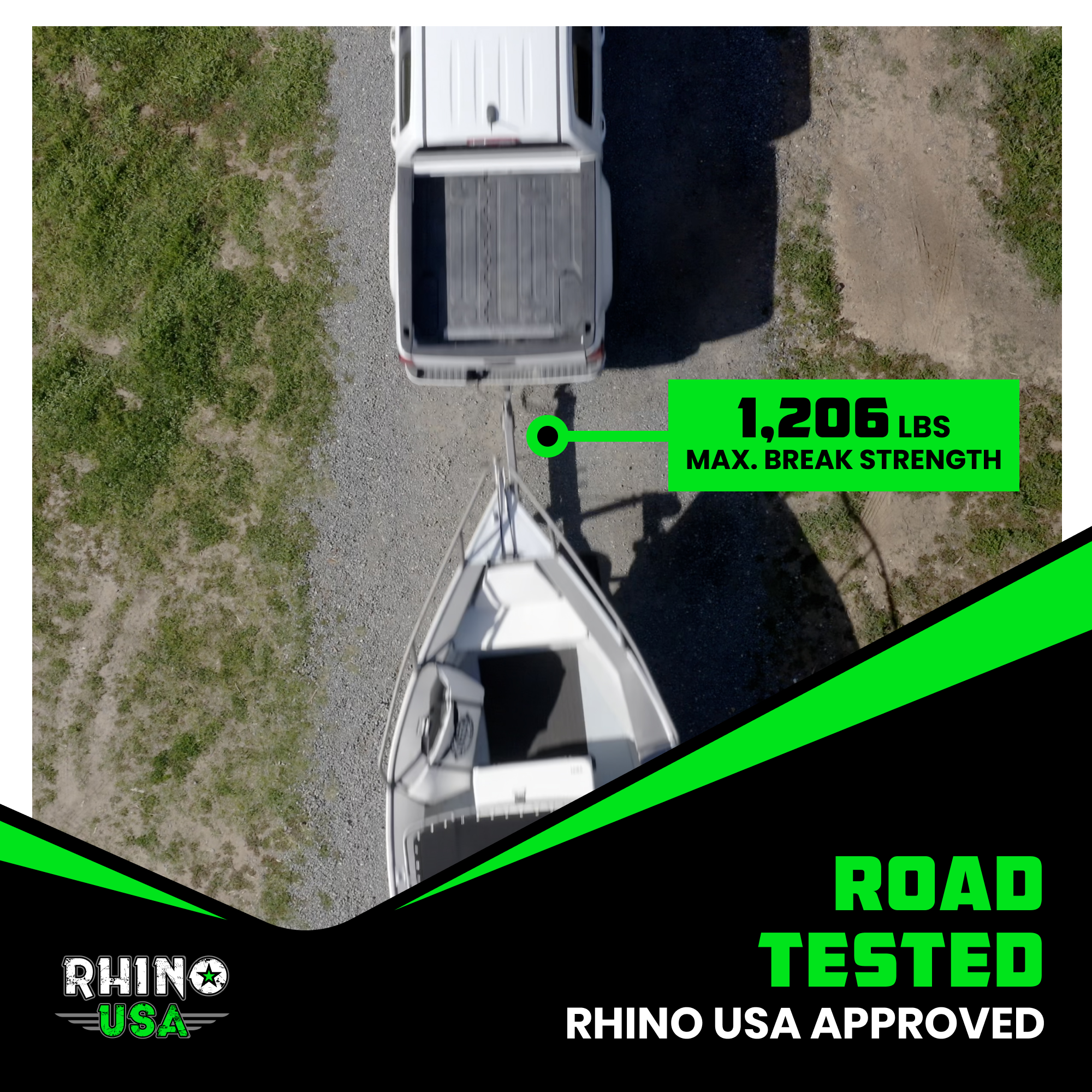 The Rhino USA boat trailer transom tie down set has a maximum break strength of 1,206 lbs and a working load limit of 402 lbs, providing robust support and security for your boat during transportation.